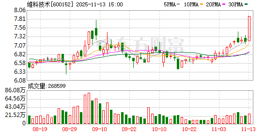 维科技术(600152)今日涨停,全天换手率5.08%,成交额2.09亿元,振幅9.75%。龙虎榜数据显示,营业部席位合计净买入3210.01万元。